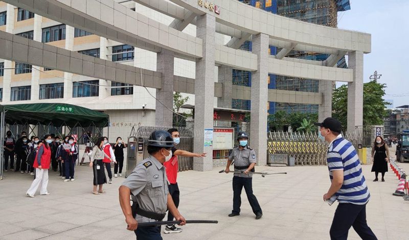 現場模擬的突發事件中有一名“不法分子”意圖闖進學校,正遇到學生放學時間。在場的教師請同學們不要慌張,聽從老師的指揮撤離事故現場,迅速跑到教學樓,關好門。其他在場教師立即趕到保安室按一鍵報警系統進行報警。老師與不法分子周旋,對不法分子進行勸說,以拖延時間。學校保安人員迅速控制“不法分子”,把危險消除萌芽狀態,成功將“不法分子”制服并帶離現場。