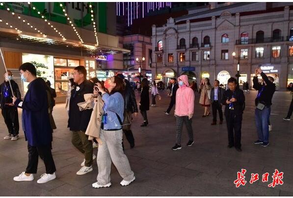10月18日晚,百名網媒總編興致勃勃地逛江漢路。