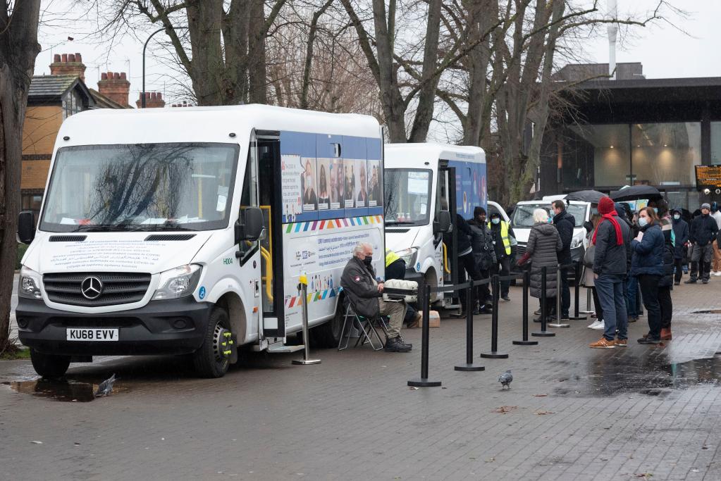 2021年12月6日,在英國倫敦,人們在新冠疫苗接種車旁排隊等待。(新華社發)