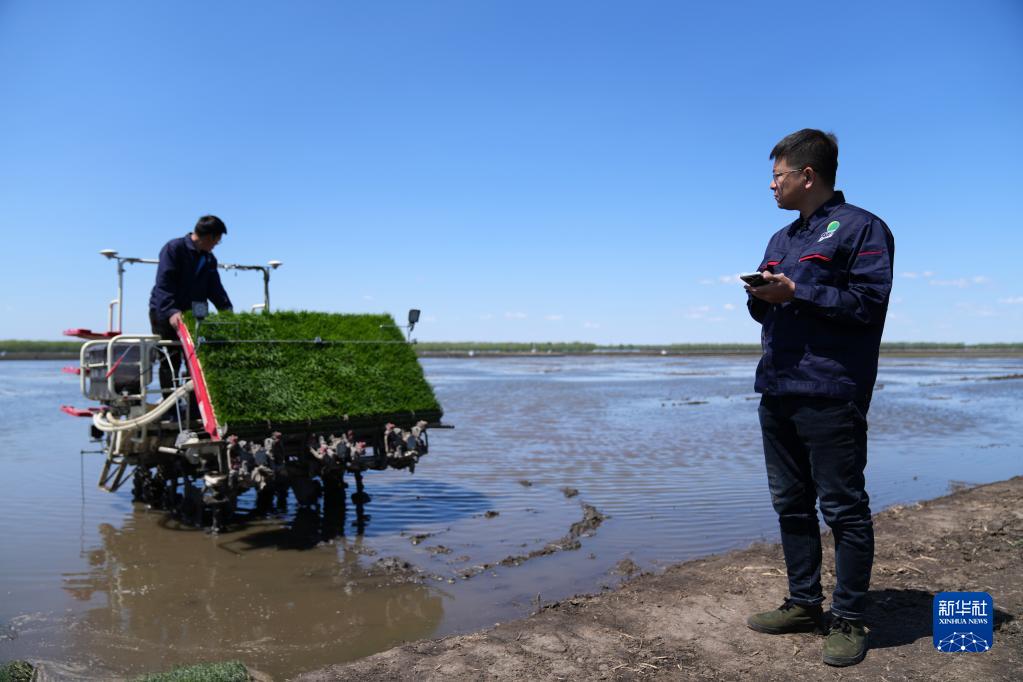 在北大荒集團建三江分公司七星農場有限公司萬畝稻田邊,農機手陸向導連續輕觸兩下手機,一臺帶有北斗導航系統的無人駕駛插秧機開始作業。