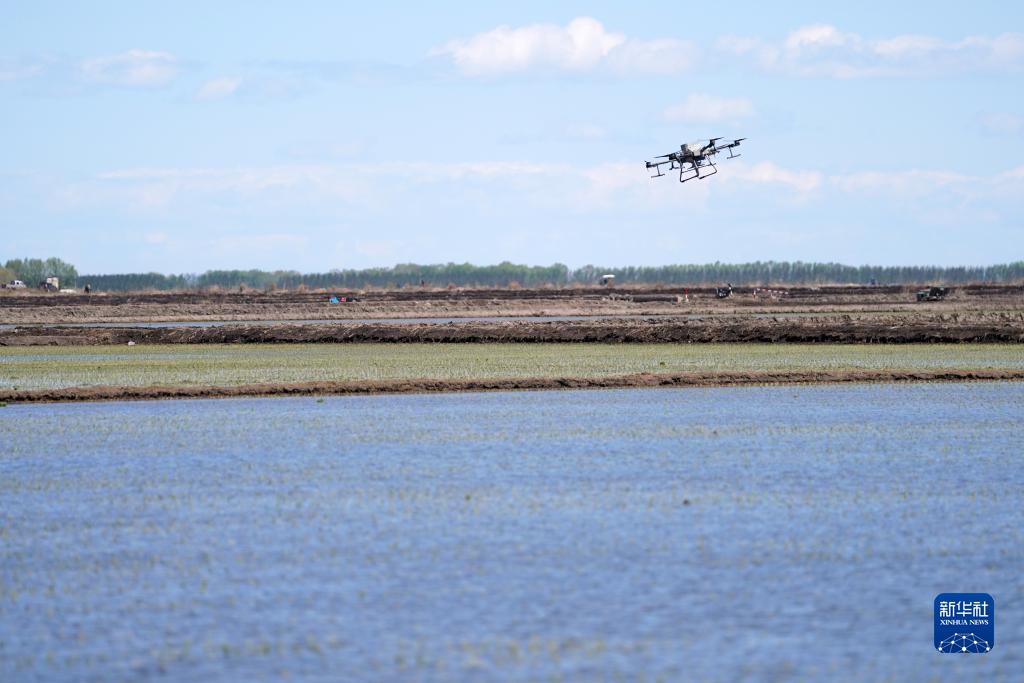 無人機在北大荒集團七星農場有限公司一塊稻田中作業(5月18日攝)。新華社記者 王建威 攝