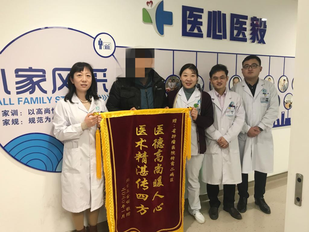 孟雪(左一)與團(tuán)隊(duì)成員共同接受患者贈(zèng)送的錦旗。山東省腫瘤醫(yī)院供圖