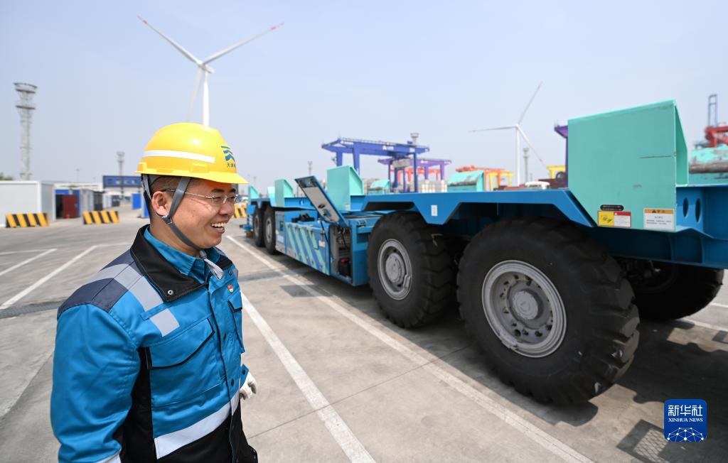 在天津港北疆港區C段智能化集裝箱碼頭,工人參觀“水平運輸機器人”(2022年4月29日攝)。新華社記者 李然 攝