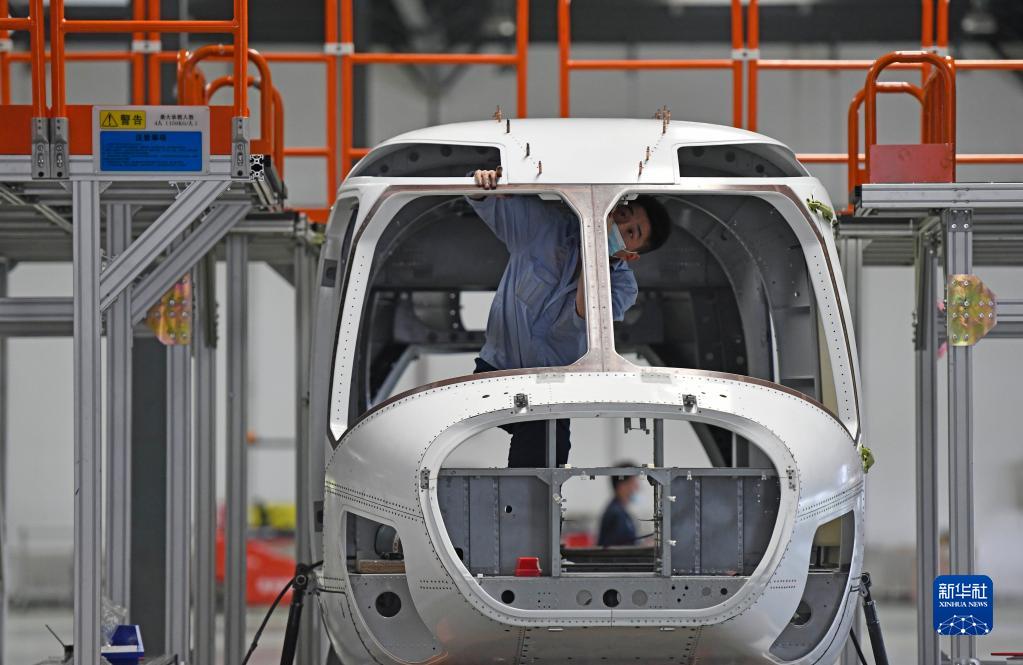 在中國航空工業集團天津直升機有限責任公司車間內,工作人員在進行AC332民用直升機的鉚接作業(2022年5月19日攝)。新華社記者 趙子碩 攝