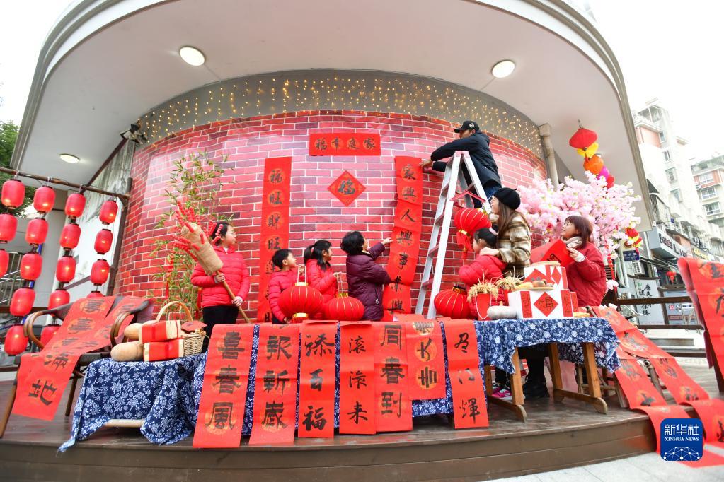 1月21日,在浙江省建德市新安江街道健安社區(qū),人們在社區(qū)大門口貼春聯(lián)、掛燈籠。新華社發(fā)(寧文武 攝)