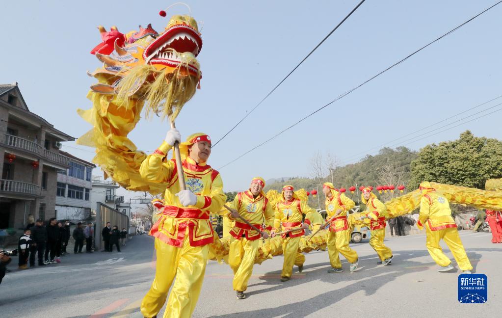 浙江湖州市德清縣莫干山鎮(zhèn)的村民在表演舞龍(1月19日攝)。新華社發(fā)(謝尚國 攝)
