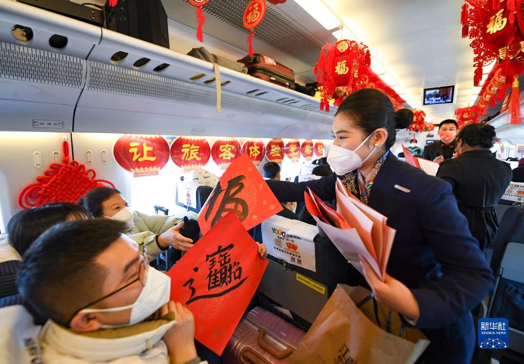 銀川客運段工作人員在由銀川開往蘭州的D8933次列車上為旅客送上小禮物(1月19日攝)。新華社記者 馮開華 攝