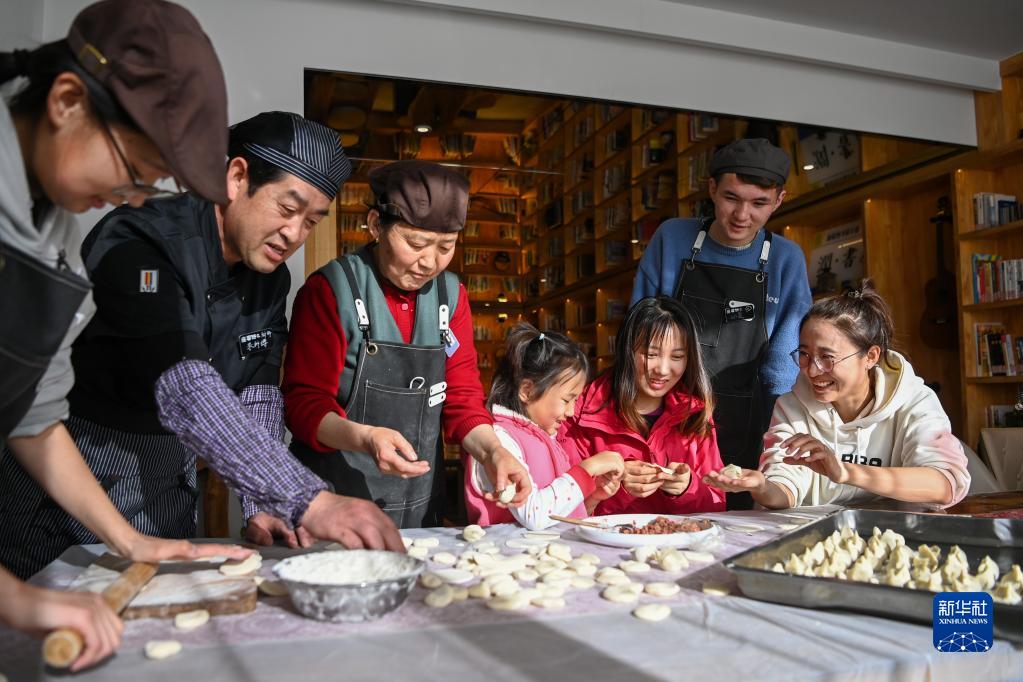 在位于新疆烏魯木齊縣板房溝鄉(xiāng)的樂野民宿,來自廣州的游客柳佳佳(右三)一家和民宿工作人員一起包餃子(1月20日攝)。新華社記者 丁磊 攝