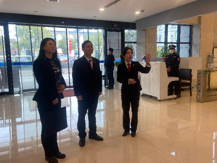 陳瑋(左一)在衢州市中級人民法院走訪調研。(新華社記者黃筱 攝)