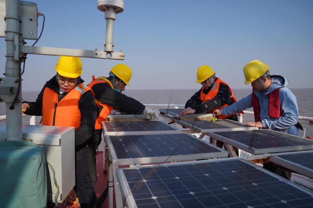 在燈船上拆光伏板和自動氣象站。新華社記者 周杉 攝