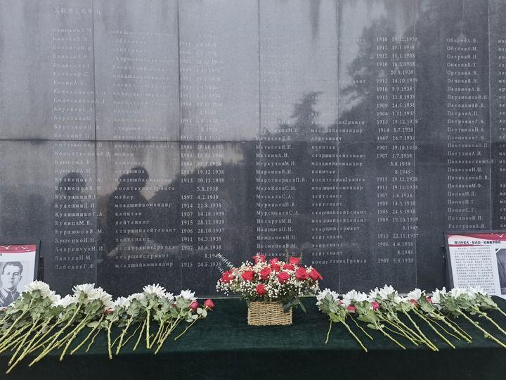 在南京抗日航空烈士紀念館鐫刻有蘇聯籍抗日航空英烈名錄的紀念碑前,擺放著人們獻上的鮮花(2024年11月22日攝)。新華社記者 邱冰清 攝
