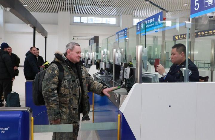 2024年12月10日,在黑河公路口岸旅檢大廳,黑河出入境邊防檢查站民警為首班次客車入境旅客辦理邊檢通關手續。當日,中國黑河公路口岸—俄羅斯卡尼庫爾干公路口岸旅客運輸正式開通。新華社發(劉松攝)