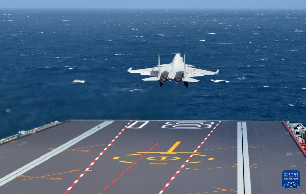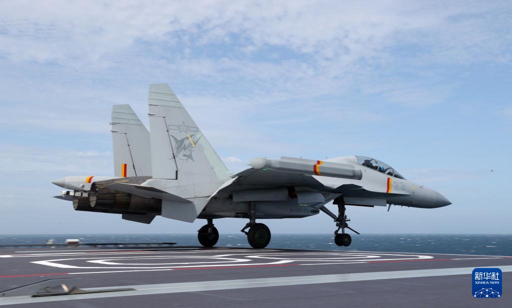 日前,海軍福建艦開展入列后首次海上實兵訓練。這是殲-15DT艦載機著艦。新華社發(姜超 攝)