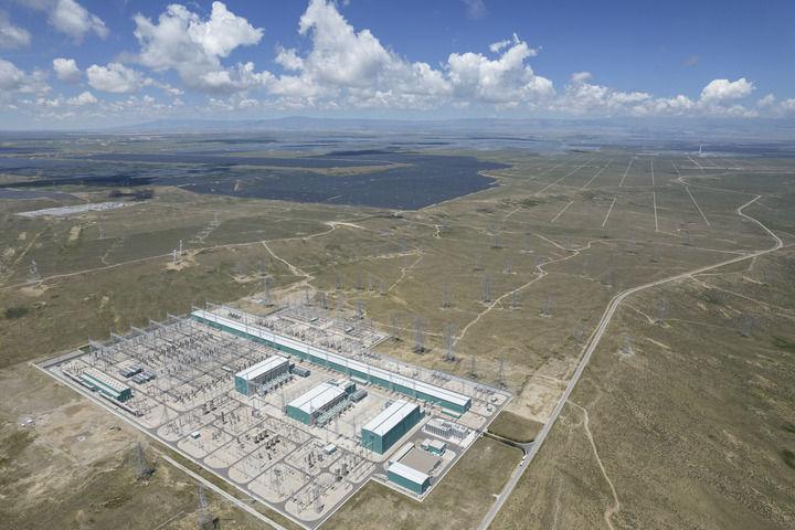 這是2025年7月25日在青海省海南藏族自治州共和縣拍攝的±800千伏特高壓青南換流站(無人機照片)。新華社記者 孫瑞博 攝