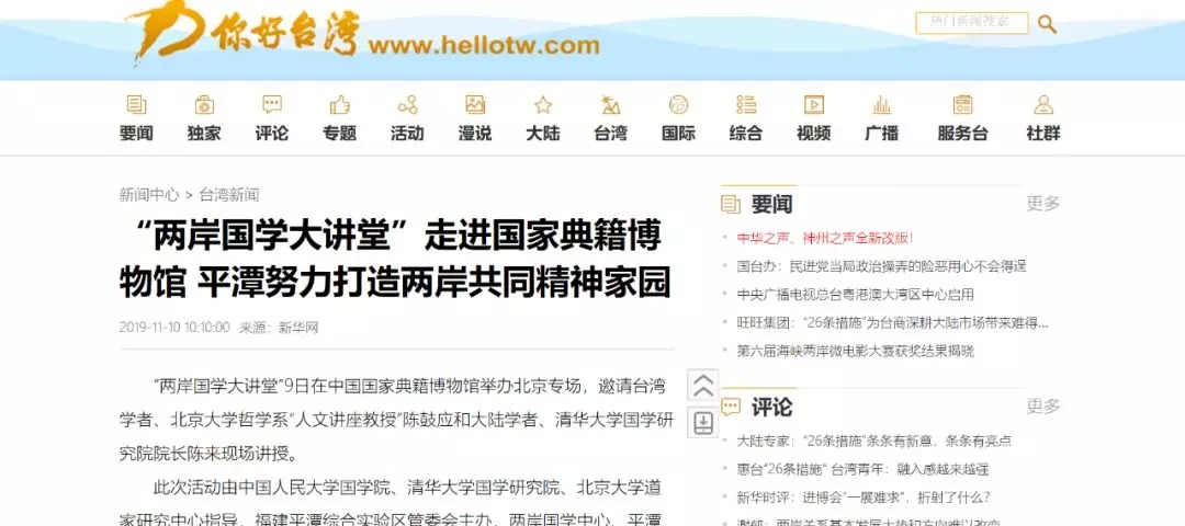 臺灣中時電子報刊發兩岸國學大講堂內容