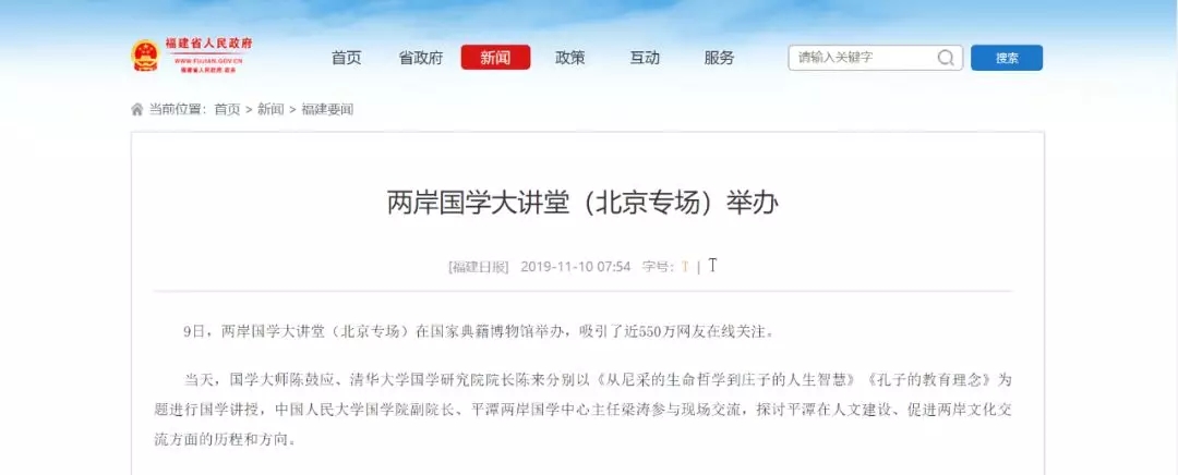 2019-11-12 08:21:51 來源:平潭網 作者:視頻:央視網 東南衛視平潭網11月12日訊 9日,“兩岸國學大講堂”在中國國家典籍博物館舉辦北京專場,吸引了新華社、人民日報、中央電視臺、中國日報、中新社、新華網、人民網、海外網、中國網、中新網、你好臺灣網、中國臺灣網、中央統戰部網站、中國和平統一促進會網站以及福建省人民政府網站、福建日報、福建電視臺、東南網、臺海網、海峽之聲、旺旺中時、東森新聞、臺灣新浪網等上百家主流媒體、網站聚焦報道。活動當天視頻直播吸引550萬網友在線觀看,截止目前,活動的視頻播放量已達1370萬人次。