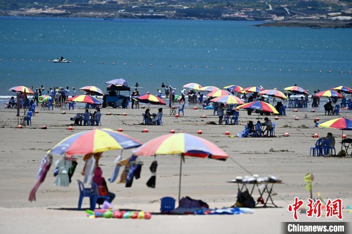 /7月2日,夏日炎炎,福建省平潭綜合實驗區(qū)龍鳳頭海濱浴場吸引眾多游客前來玩水避暑。圖為游客在海邊沙灘納涼。中新社記者 王東明 攝