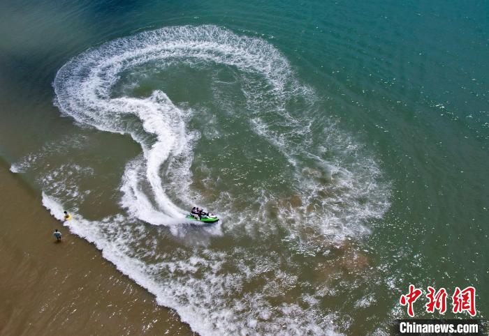 /7月2日,夏日炎炎,福建省平潭綜合實驗區(qū)龍鳳頭海濱浴場吸引眾多游客前來玩水避暑。圖為游客駕駛水上摩托艇。(無人機(jī)照片)中新社記者 王東明 攝