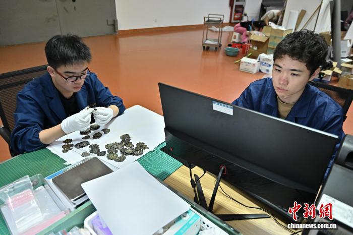 9月9日,臺灣青年蕭先誠(左)和張育銘在進行文物整理工作。中新社記者 韋亮 攝
