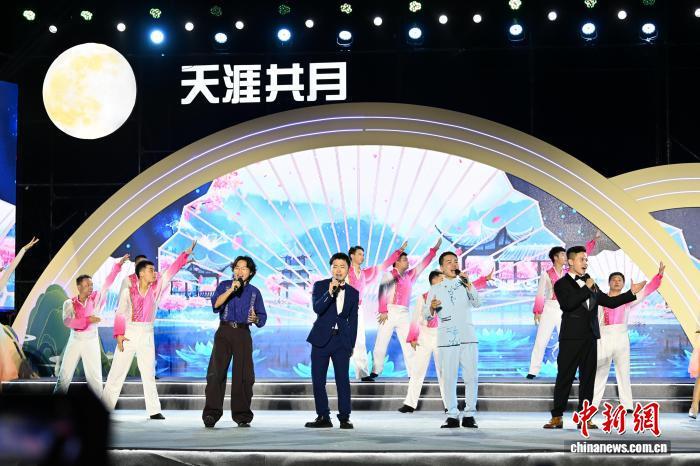 9月28日晚,第六屆海峽客家中秋晚會在福建省龍巖市龍津湖公園舉行。圖為兩岸客家歌手同臺獻(xiàn)唱。中新社記者 張金川 攝
