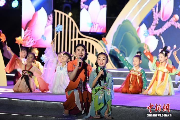 9月28日晚,第六屆海峽客家中秋晚會在福建省龍巖市龍津湖公園舉行。圖為來自梅州的李詩琪(左)和陳思霖演唱新客家山歌《八月十五月光光》。中新社記者 張金川 攝